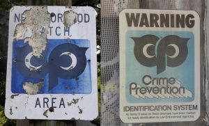 Everybody recognizes the old Neighborhood Watch signs on the left, but does anyone recognize the old Operation Identification sticker on the right? The two systems used to be paired, but Operation ID was a hassle and inconvenient, so it faded away. If you do a web search for the term “Operation Identification,” you’ll see police departments all over the country STILL urge citizens to use it.