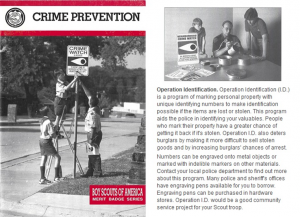 The Scouts of America offer a crime prevention merit badge. The details and workings of Operation Identification has been published for over 40 years in the last two manuals. As you can see by the pictures, Neighborhood Watch and Operation ID are intimately connected.